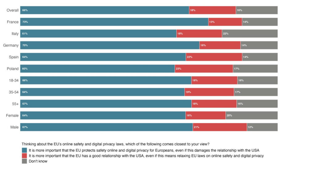 And the numbers show that Europeans welcome this attitude from the Commission: between 60-73% of respondents support the EU defending online safety and digital privacy, even if this damages the relationship with the United States [5]. The response back to the Commission is just as clear: Europeans want leaders who aren’t afraid to stand up to Big Tech.